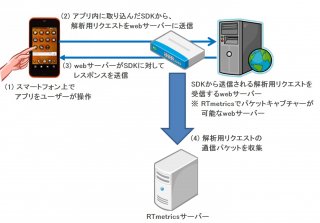 スマートフォンアプリの解析に必要な情報を「スマートファンアプリ解析SDK」に自由にセットし、その情報を「RTmetrics」で取得できます。