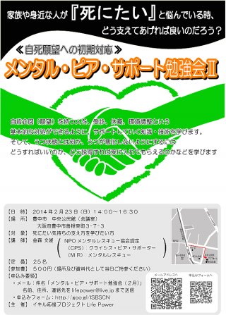 うつ病などの生きづらさを抱えた人を応援する団体、イキル応援プロジェクト Life Powerは、2014年2月23日(日) 14:00~16:30に【メンタル・ピア・サポート勉強会Ⅱ】~自死願望への初期対応~を豊中市立中央公民館(大阪)にて開催します。