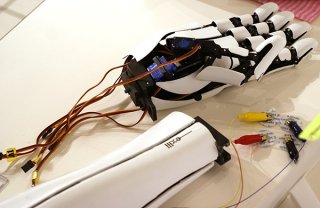 見事に大賞を獲得したのは、大阪府からご応募いただいた「筋電義手“Handie”」。山浦博志氏(メカ)・近藤玄大氏(ソフトウェア)・小西哲哉氏(デザイン)の3名によるユニット「exiii」による作品で、安価ながらも機能的でスタイリッシュな未来の節電義手です。モーター数を最小限に抑えて3Dプリンタで造形し、情報処理を自作の節電センサーとスマートフォンで行うことにより、材料費を2万円以下に抑えて、しかもファッション性も兼ね備えています。