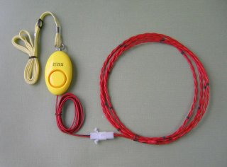 「規格」(A)電子ブザー:音量105db (B)電池:LR44型ボタン電池(3個)4.5V (C)ケース材質:難燃性ABC樹脂成型品 (D)コネクタ付コード(0.3sq×2C/1m)