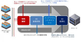 「Atlantis ILIO」は、VDIとストレージ間を仲介し、ストレージI/Oを削減する技術、I/Oとデータのインライン重複排除技術などの独自技術によりトラフィックを最適化することで、ストレージ負荷を軽減し、高価なSSDなどを導入しなくても、比較的安価なモデルのストレージでも物理PCを凌ぐ高速VDI環境の構築が可能になります。