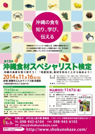 「沖縄食材スペシャリスト検定」は、沖縄の長寿をささえてきた伝統食材に関する正しい知識を身につけ、その良さを認知し理解していただくための検定です。