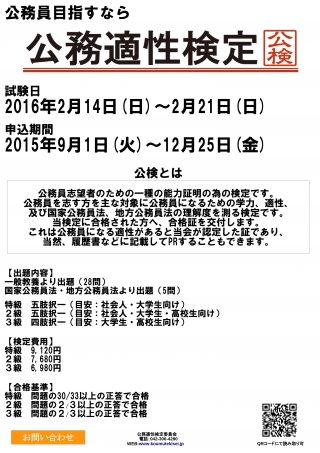 公務適性検定委員会(代表 高橋 彰)は、「公務適性検定」(公検)の受検者を9月より募集を開始しており、団体受検を申し込んだ団体、もしくは団体の長に団体実施報酬金を支払う制度を定めた。