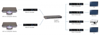 「RAV-IP」は、エンコーダ(送信機)とデコーダ(受信機)で構成され、入力デバイス(AVソース)と出力デバイス(ディスプレイやプロジェクタ)にUSBなどで接続し、Cat5 / 6 UTPケーブルまたは光ファイバケーブルでギガビットEthernetスイッチに接続するだけで、自動的にIPアドレスが設定されるため、高価なAV制御システムや、ネットワークおよびAV制御の専門的な知識や経験は不要です。