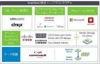 「SmartStack」は、NimbleとCiscoが共同で開発した垂直統合インフラストラクチャーで、VMware、Citrix、Microsoft、Oracleなど多数の主要アプリケーションが検証済みで、仮想デスクトップ(VDI)、プライベートクラウド、各種ビジネスアプリケーションなど、幅広いワークロードに対応したソリューションを提供します。
