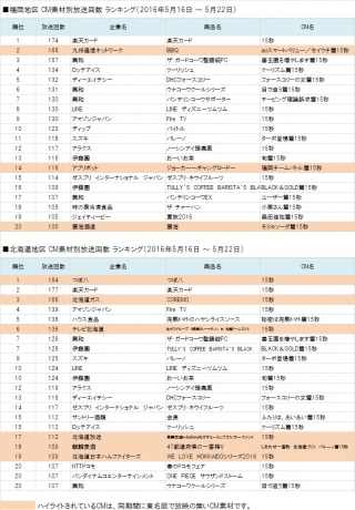 テスト運用を行った5月の福岡・北海道のデータのうち、先週(5月16日 ~5月22日 )の各エリアのCM素材別放送回数ランキングTOP20をご紹介いたします。