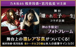 景品は、舞台のリハーサルで撮影した写真付きフォトフレームが決定!舞台「嫌われ松子の一生」のコラボ専用フォトフレームに、主演の2人いずれかの写真を付けてお届けします。写真は、桜井玲香と若月佑美それぞれ3パターンをご用意しております。「神の手」だけでしか手に入らない、1,000個/人ずつ、計2,000個の数量限定となっております!お早めにご参加下さい。