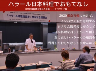 急増する訪日イスラム教徒に対し、ハラールに配慮された日本料理を正しく提供できる知識と技能をもった調理師を育成する目的で始めました。 本講座を修了した方には、一般社団法人全国日本調理技能士会連合会・大阪府日本調理技能士会・NPO法人 日本ハラール協会・日本料理国際化協会が連名で発行する《ハラール調理講習修了証》を発行します(調理師免許をお持ちの方で、認定試験に合格された方には「ハラール調理師」認定証を授与します)。2020東京オリンピック・パラリンピックに向けてインバウンドにおけるハラール対応はもはや必須といえます。この際に、ぜひ学んでみませんか。
