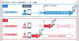 『いますぐMNP転入』は、お客様がSIMカードをお受け取り後、会員専用Webサイト「MyDTI」からMNP(携帯電話ナンバーポータビリティ)転入希望日時を指定して予約する機能に、「いますぐ」※3MNP転入いただける業界初の仕組みを実装したものです。