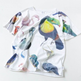 前身ボディにイラストプリントが施されたTシャツは袖部分に切り替えしがなくドルマンスリーブ風のシルエット。鳥・ねこ・恐竜など人気のアニマル柄から、カラフルなキャンプ道具・ルアーなどのアウトドア柄まで、全10柄。