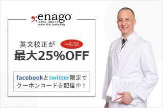 英文校正エナゴのフェイスブック、ツイッターのサイトにて英文校正が最大25%オフとなる