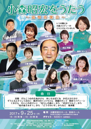 イベント企画/タレントマネジメントを手掛ける、株式会社フットプリンツ(所在地:東京都港区、代表取締役:山中知美)は、「小森昭宏をうたう ~追悼音楽会~」を、2017年9月25日(月) 開場/18:00 開演/18:30に開催します。