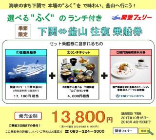 関釜フェリー株式会社(本社:下関市)では、下関~釜山往復乗船券に、海峡のまち下関で本場の〝ふく〟のランチと関門海峡喫茶利用券がセットになった、お得な特典付き往復乗船券を販売開始いたします。