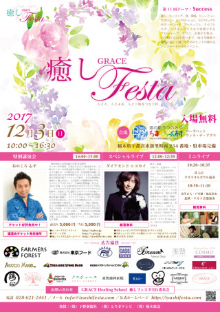 毎年来場者数約1万人を記録している、北関東最大の癒しのトータルイベント「GRACE癒しフェスタ」。「人と人、人と未来、人と土地をつなぐ 絆」をコンセプトに、癒し、ヒーリング、食、環境、ビューティー、エコロジー、リラクゼーション、スピリチュアル、ボディーワーク、クラフ ト、音楽、アートなど、今年も全国から約133ブースの様々な体感できる企業、プロショップ、サロンが大集合。お子様からお年寄りまで、毎日を 健康で豊かに美しく暮らすためのヒントが探せるトレジャートータルイベント。11回目の開催となる今年のテーマは「Success」。イベントのスペシャルゲストとして「ダイアモンド✡ユカイ」さんを迎えたスペシャルライブや、「ヒーリングの未来」〜ココロの癒し、カラダの癒しの時代変化〜をテーマにした「おのころ心平」さん特別講演会、地元のアーティストによる音楽ライブなどを同時開催。
