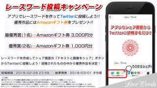 レースワードを作成後、シェア画面の「テキストと画像をシェア」ボタンより、自身のツイッターアカウントへシェアする事で応募完了となり、レースワード公式Twitterアカウント(@LaceWords)をフォローしているユーザーが投稿したレースワードを対象に審査を行い優秀作品を選出する。