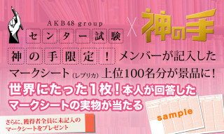 「神の手」では、明日開催される「AKB48グループセンター試験」で、受験したメンバーが記入したマークシートのレプリカセットがゲットできるコラボ企画を開始いたします。