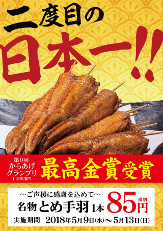 本日4月18日 発表の日本唐揚協会主催「第9回からあげグランプリ」の手羽先部門において、3年ぶり2度目の最高金賞を受賞しました。