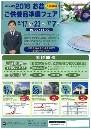 冠婚葬祭業を手掛ける、株式会社メモリード東京(所在地:東京都世田谷区砧2-4-27、代表取締役:小暮大明)は、「2018 お盆 ご供養品準備フェア」を、各運営ホールで2018年6月17日(日) ,23日(土),7月7日(土) 10:00-14:00に開催します。