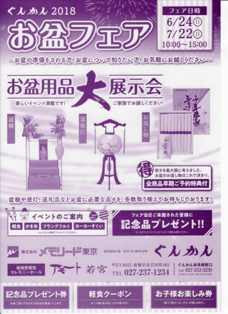 冠婚葬祭業を手掛ける、株式会社メモリード東京 ぐんかん事業部(所在地:群馬県前橋市北代田町457-1、代表取締役会長:小林正明)は、「ぐんかん2018お盆フェア ~お盆用品大展示会~」を、群馬県内の各ホールで2018年6月24日(日) ,7月8日(日) ,22日(日)10:00-15:00に開催します。