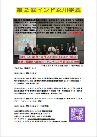 来る10月20日 國學院大學平成30年度ホームカミングデーにて、第2回インド女川学会を開催いたします。震災以降に交流がはじまったインドと女川町。その交流を軸にインドについて、女川について考え、それを発表する場。それがインド女川学会です。第2回インド女川学会の日時とプログラムは以下の通りです。今回もインド大使館の協力により、大使館VCC専属ヨガ講師のへマント・シャルマ先生による座りヨガの実演もあります。座ったままの状態で簡単にできるヨガです。皆さま奮ってご参加ください。※入場無料です。