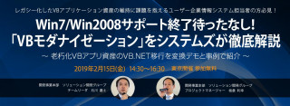 株式会社システムズ(本社:東京都品川区、代表取締役社長:小河原隆史)は、2月15日(金) に東京・五反田の東京本社セミナールームで、「Win7/Win2008サポート終了待ったなし! “VBモダナイゼーション”をシステムズが徹底解説」~VBアプリ資産のVB.NET移行を変換デモと事例で紹介~ と題したプライベートセミナーを開催します。