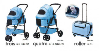 キャリータイプの「roller(ローラー)」はスカイブルー・ホワイト・ブラックの3色展開。丈夫で軽く約3kg。大きく開く扉でペットの出し入れがスムーズに。