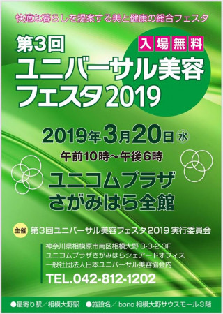 第3回ユニバーサル美容フェスタ2019実行委員会は、『第3回ユニバーサル美容フェスタ2019』を、2019年3月20日(水) 午前10 時~午後6 時に開催します。