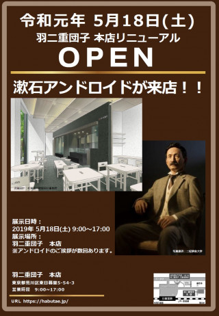 文政2年創業、200年の歴史を持つ団子、和菓子の老舗 「羽二重団子」(東京都荒川区東日暮里5-54-3 代表取締役社長:澤野修一)の本店が2019年5月18日(土) 9:00にリニューアルオープンいたします。当日は二松学舎大学から漱石アンドロイドが来店。数回に渡りご挨拶をされます。ぜひご来店是非ご来店賜り、ご覧ください。