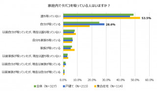 不動産関連の比較査定サイト「リビンマッチ」を運営するリビン・テクノロジーズ株式会社(本社:東京都中央区、代表取締役:川合 大無)は、世界保健機構(WHO)により毎年5月31日 に定められた「世界禁煙デー」に合わせて、「リビンマッチ」を利用した20歳以上の男女全国327人を対象に「自宅での喫煙と受動喫煙防止策」について調査しました。