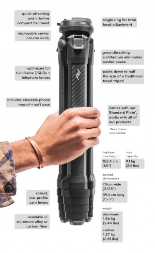 各種カメラアクセサリーで知られるPeak Design社が開発したコンパクトながら本格的な三脚です。
