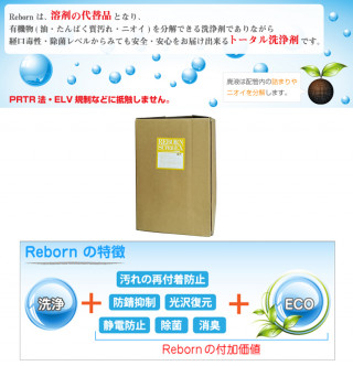 「環境低負荷洗浄剤リボーンスーパーEX」がこれまでの洗浄剤・消臭剤と全く違う点を一言で言い表すと有機物を分解してしまうことです。多くの工場・製造関連で困っている汚れや臭いの元(油も含む)は殆どが有機物であり、リボーンスーパーEXは有機物を分解してしまいます。 さらに使用後の副次的効果として洗浄面における汚れ の再付着防止・防錆抑制・光沢復元・静電防止・除菌・消臭といった効能がリボーンスーパーEXのメリットです。