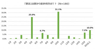 住まい選びや店選びなど様々な選択に意外と重要視される駅からの所要時間。“駅近”という謳い文句もよく耳にしますが、“駅近”に対する定義は特にありません。そこで、リビンマッチを利用した首都圏在住の20歳以上の男女 180人に「駅近は駅から徒歩何分までか?」聞いてみました。アンケート全体の平均は8.2分となり、『10分』(31.1%)、『5分』(25.0%)と回答する人で半数を超えました。また、『16分以上』も10.0%いました。