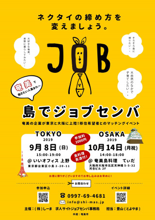 奄美大島の地域情報サイト「しーまブログ」やフリーペーパー「みしょらんガイド」、「amammy」、「JOBSENBA」を発刊している、株式会社しーま(所在地:鹿児島県奄美市名瀬佐大熊町11-11 代表取締役:深田小次郎)が、9月8日 に東京、10月14日 に大阪で、奄美への移住を考える人に向けた職業支援イベント「島でジョブセンバ2019」を実施します。