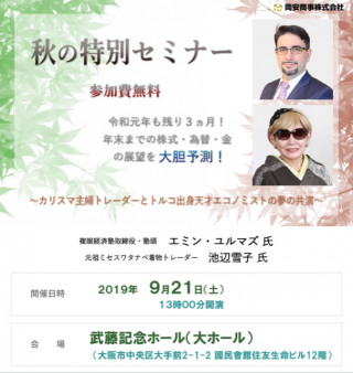 金融商品取引サービスを提供する岡安商事株式会社(本社:大阪市中央区、取締役社長:姫野健一)は2019年9月21日(土) 13時より、大阪天満橋・國民會館12F武藤記念大ホールにて参加費無料の経済講演会「秋の特別セミナー2019」を開催します。