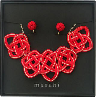 musubi-賀寿シリーズは、ネックレス・髪飾り・イヤリング・ブローチ・カフスボタン・ピンバッジなどのアイテムがあり、プレゼントボックスに入って4タイプ(単品または詰め合わせ) 赤・紫・黄のカラーバリエーションで展開。価格は¥4,374〜¥7,020