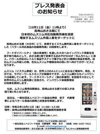 高崎山おさる館(大分市)にて、急増するイスラム圏外国人客をターゲットとした「ハラール対応食品の自動販売機」の設置をします。フードダイバーシティ(食の多様性)を通した大分へのインバウンド誘客を目指す取り組みとして、おさる館1階で営業するおみやげSHOP「もんちゃん」に導入。ハラール対応のレトルト食品やスナック菓子など約15種類の食品を販売。訪日ムスリム外国人の他、在日ムスリムや健康志向の高い方へ向けてのサービスとなります。ムスリム(イスラム教徒)は、世界人口の4人に1人に迫るほど増加中。現在、大分では、ラグビーワールドカップが開催中ですが、ムスリム圏からもインバウンドは大分へ来ています。フードダイバーシティ(食の多様性)を目指す大分として世界中のムスリム観光客に注目され、インバウンド来県数増加の効果を期待します。