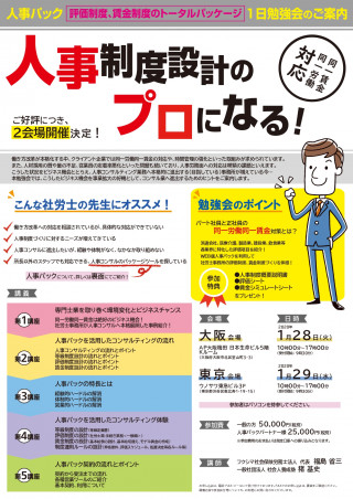 また、人事パックを活用した人事コンサルティングの流れと新規営業の進め方をご説明させていただきますので、人事コンサルティング事業にご興味のある方にはぜひご出席いただきたいセミナーです。