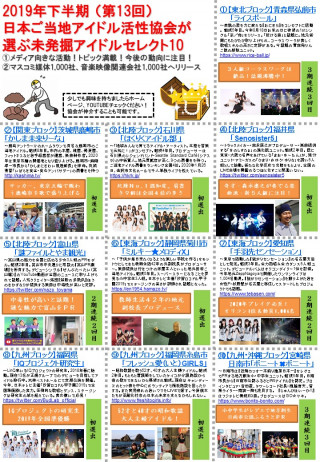 日本ご当地アイドル活性協会はこのほど、『2019年下半期(第13回)未発掘アイドルセレクト10』を発表した。メモリアルイヤー2020年に向け、協会が近い将来にブレイクが期待されるニューカマーを紹介する企画で全国から10組のアイドルをセレクト。今回で7年目、第13回。