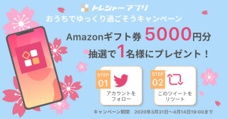 2020年3月31日 から4月14日 19:00までの間、トレジャーアプリ公式ツイッターアカウントでお家でゆっくり過ごそうキャンペーンを開催いたします。フォロー&リツイートで抽選で1名様にAmazonギフト券5000円分をプレゼントいたします。