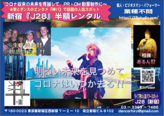 毎月上演している歌のダンスのエンタメ『神パ』でライブ界のパワースポットとして人気の、新宿『J28』が、PR・CM動画作成に、マイク照明諸機材込みの3時間、半額1万5千円(通常¥3万)の格安レンタルする事になった。