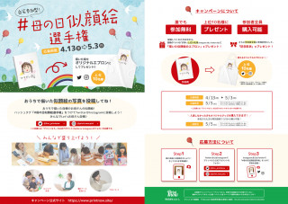 応募期間の間instaglam 及びTwitter 上でハッシュタグ# 母の日似顔絵選手権、#PRINTNOW) をつけて画像を投稿するだけで参加できます。その中から抽選で10 名様(イイネ数上位10 名)に無料で似顔絵イラスト入りオリジナルエプロンをプレゼントいたします。抽選で外れた方も一般販売として購入可能となります。