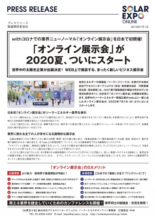 自然エネルギーの情報誌『ソーラージャーナル』を発行する株式会社アクセスインターナショナル(本社:東京都渋谷区 代表取締役社長:清水朋宏)は、コロナ下で直接商談の機会が失われていた現状を解決すべく、日本初で「オンライン展示会」の開催を実現します。世界中のソーラーエネルギー関連企業がweb上に一堂に会したオンライン展示会が、2020年7月1日(水)よりいよいよスタートします。