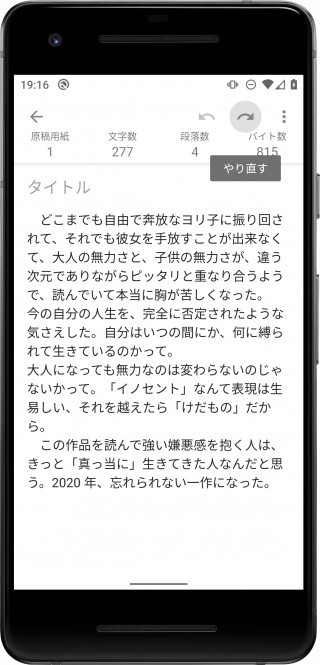 『CountablePad』( https://play.google.com/store/apps/details?id=cutboss.countablepad )は、メモ帳アプリの素朴な機能をベースに、「文字数」「400字詰原稿用紙換算枚数」「単語数」「段落数」などをカウントする機能を追加しています。