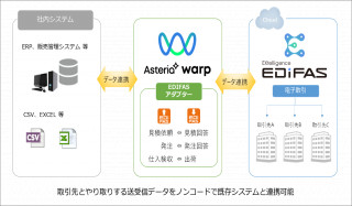 アステリア株式会社(本社:東京都品川区、代表取締役社長:平野洋一郎、証券コード:3853、以下 アステリア)と株式会社エクス(本社:大阪府北区、代表取締役:抱厚志、以下 エクス)は、国内の企業データ連携(EAI/ESB)製品市場で14年間連続シェアNo.1※1を誇るASTERIA Warpと、製造業を中心に国内外1100社を超える企業が利用し、中小企業庁が推奨する「中小企業共通EDI※2」に準拠しているクラウド型EDI※3サービスEXtelligence EDIFAS(以下EDIFAS)との連携をノーコードで実現する専用アダプター「EDIFASアダプター」の提供を9月9日 より開始します。