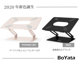 BoYataパソコンスタンドは、インテリアにもなるほどのデザイン性の高さに定評があり、今シーズンの新色は、ゴージャスなイメージのシャンパンゴールド、高級感のあるブラックで、さらにセンスアップしたアイテムに仕上がっています。