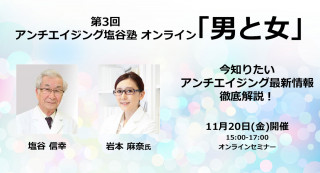 長年パリに在住し、『バリのマダムに学ぶ生涯恋愛現役の秘訣』『生涯恋愛現役 女のセンシュアル・エイジング入門』などの著書がある皮膚科専門医の岩本麻奈先生と、アンチエイジングネットワーク理事長の塩谷信幸が「男と女」をテーマにそれぞれ講演した後、トークセッションを行うちょっとドキドキするかもしれない(?)120分です。
