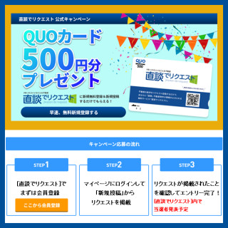 この[直談でリクエスト]に、現在、新規ユーザー登録&新規リクエスト投稿することでQUOカードプレゼントキャンペーンに参加できます。