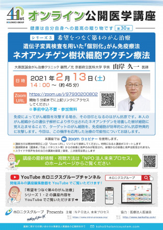 【内容】免疫によってがん細胞を攻撃する場合、その目印となるのはがん抗原です。本人のがん組織からの遺伝子解析により作り出されたネオアンチゲンを培養した樹状細胞に覚え込ませることで、ターゲットのがん細胞を、免疫細胞が効率的にがん抗原特異的に攻撃します。今回は、この機序を応用した治療の可能性についてお話します。