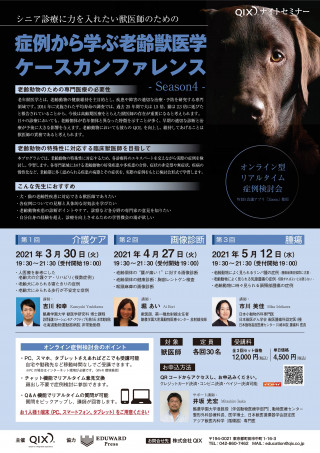 株式会社QIX(所在地:東京都町田市、代表取締役:生田目康道)は、オンライン型リアルタイム症例検討会『シニア診療に力を入れたい獣医師のための 症例から学ぶ老齢獣医学 ケースカンファレンス‐Season4‐』を開催いたします。