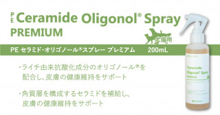 『PE セラミド・オリゴノール®スプレープレミアム』は、愛犬・愛猫の皮膚の健康維持をサポートするために、ライチ由来抗酸化成分のオリゴノール®※と角質層を構成するセラミドの2成分を配合した、動物病院専用の皮膚ケア製品です。